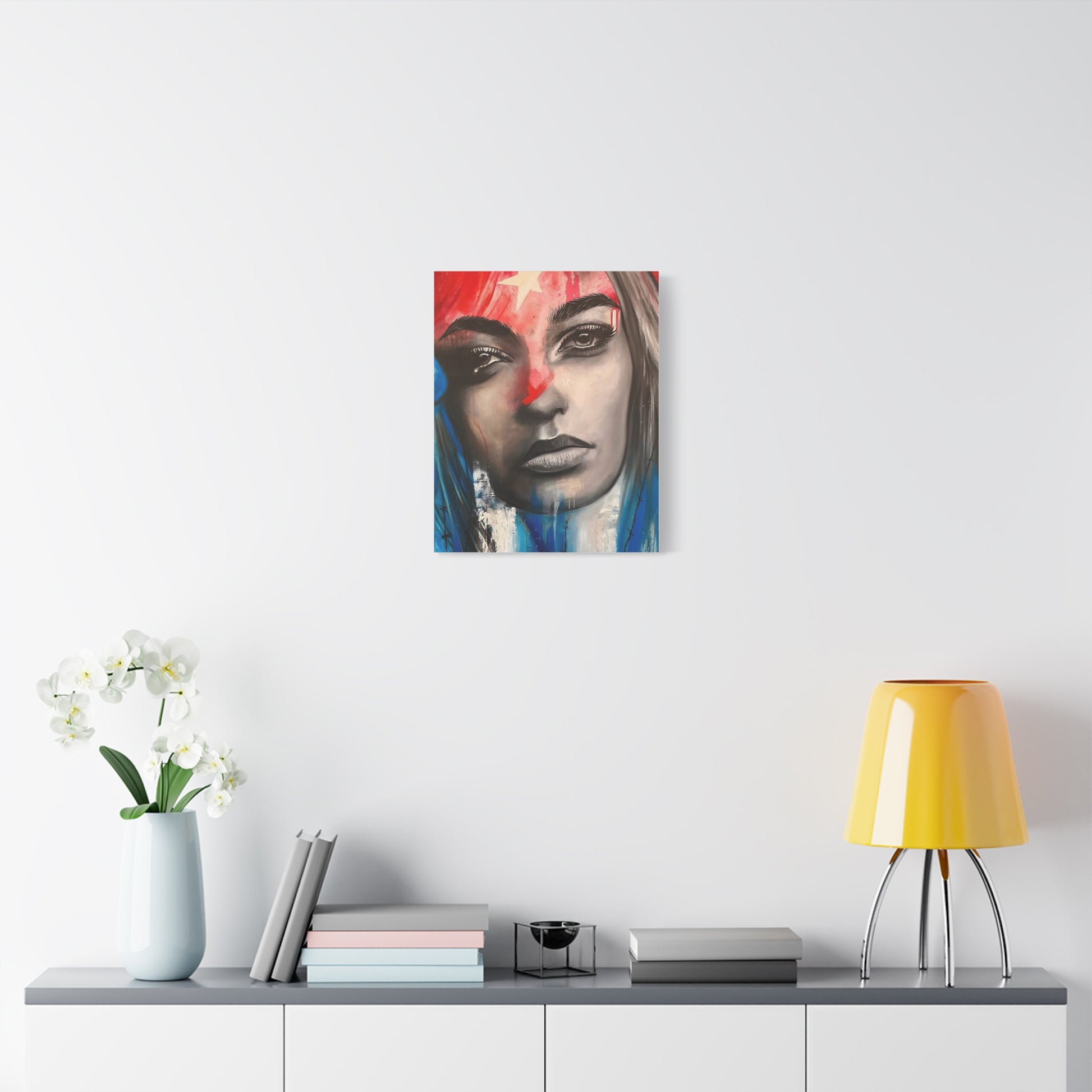 A striking stretched matte canvas that brings raw, contemporary portraiture into the room. The composition centers on a resolute face rendered in charcoal greys and smudged highlights, punctuated by bold washes of red and electric blue. The muted matte surface reduces glare and deepens printed blacks, letting the subtle brush textures and ink drips read like an original painting on cotton-poly canvas. Lightweight but sturdy, the piece ships ready to hang with a slim pine profile and soft rubber dots on the back to protect walls and keep the frame steady. It slips easily into modern living spaces, creative studios, or gallery-style arrangements where bold, urban expression is welcome.